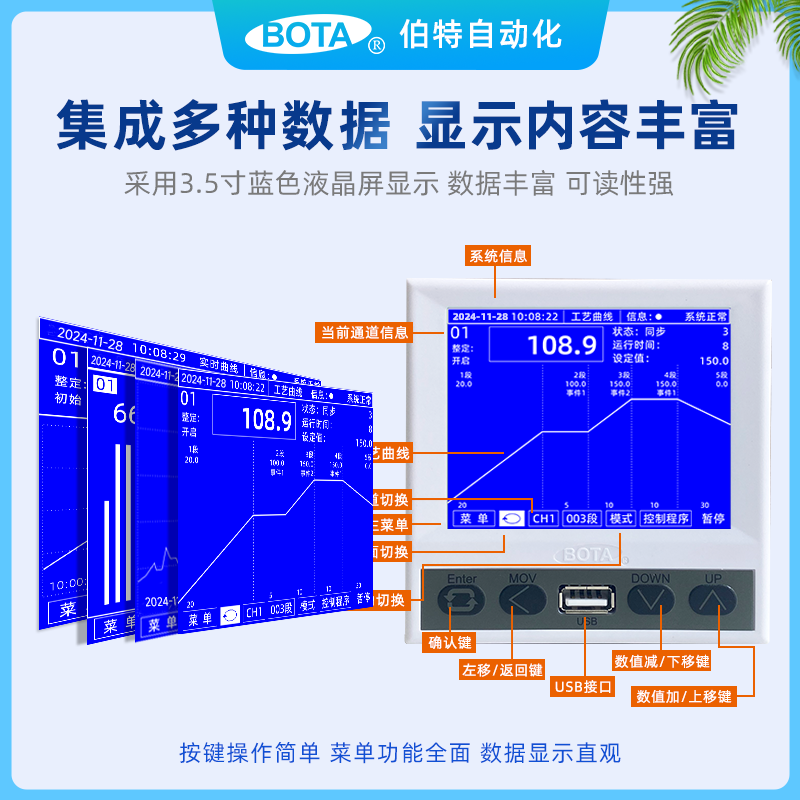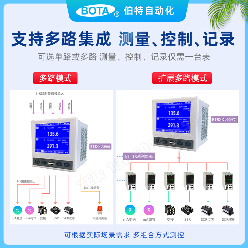 BT820/829、BT850/859多功能無紙記錄儀,采用智能PID調(diào)節(jié)、支持100段可編程、Modbus通訊、支持萬能輸入。可用于溫控、濕度、液位、流量、濕度等多種場(chǎng)景。多畫面數(shù)據(jù)內(nèi)容切換顯示:工藝曲線、實(shí)時(shí)曲線、綜合曲線、歷史曲線、報(bào)警停電記錄、棒狀圖及通道綜合信息等。可同時(shí)5路測(cè)量控制,另支持通道擴(kuò)展實(shí)現(xiàn)多路測(cè)量控制和報(bào)警輸出。支持萬能輸入,mA調(diào)節(jié)/變送、固態(tài)繼電器(SSR)、交流接觸器、可控硅過零觸發(fā)、可控硅移相觸發(fā)等。
