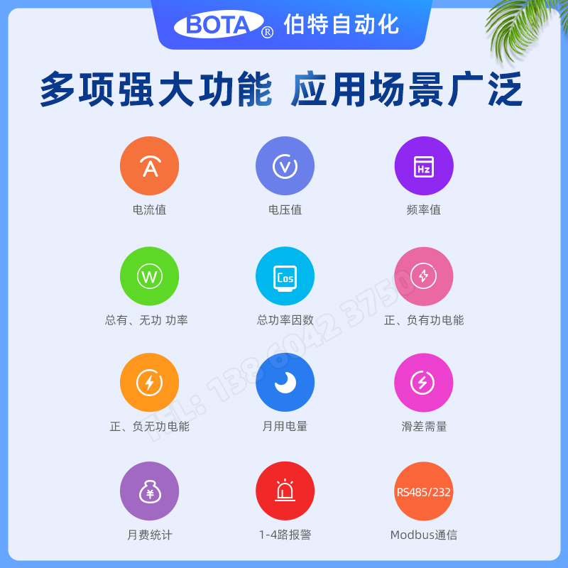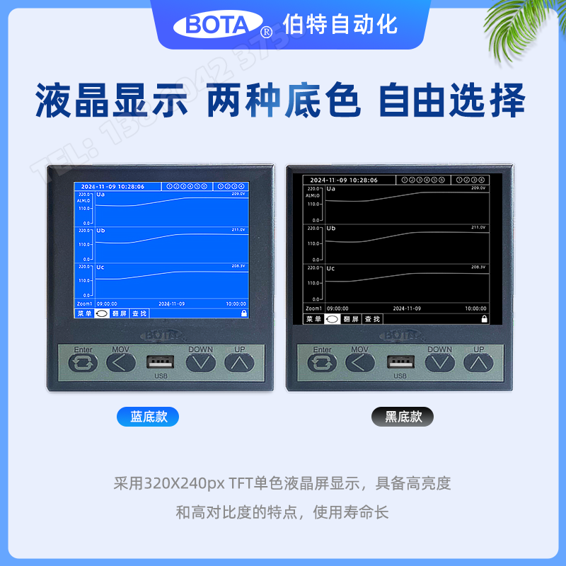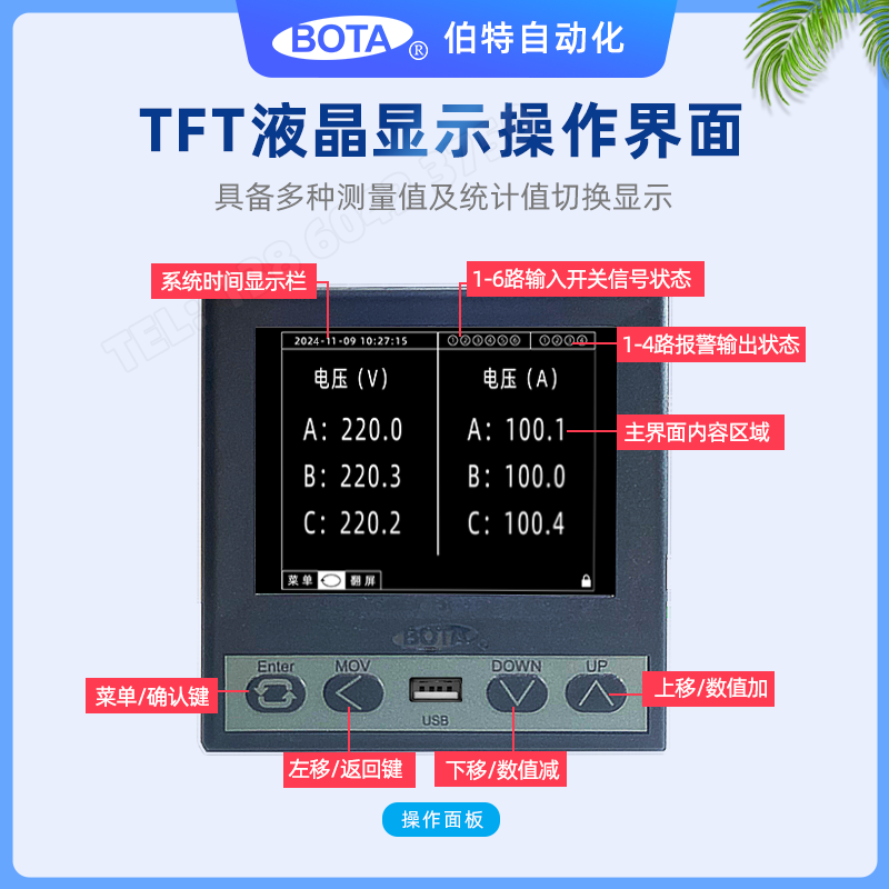 伯特M7系列3.5寸液晶屏,多功能電力測量記錄儀表;包含M75(三相三線)、M76(三相三線/四線)兩種,具備電壓、電流、功率、頻率測量、功率因數(shù)、正負有功功率、正負無功功率、月費統(tǒng)計、滑差需量、等多種電力值測量和統(tǒng)計;以及實時曲線、歷史曲線、報警記錄等。內(nèi)置480M大容量內(nèi)存,支持USB導出。