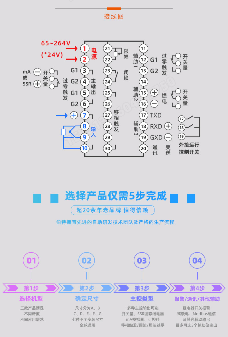 主控輸出支持固態(tài)繼電器SSR、可控硅SCR、交流接觸器、過零觸發(fā)、移相觸發(fā)